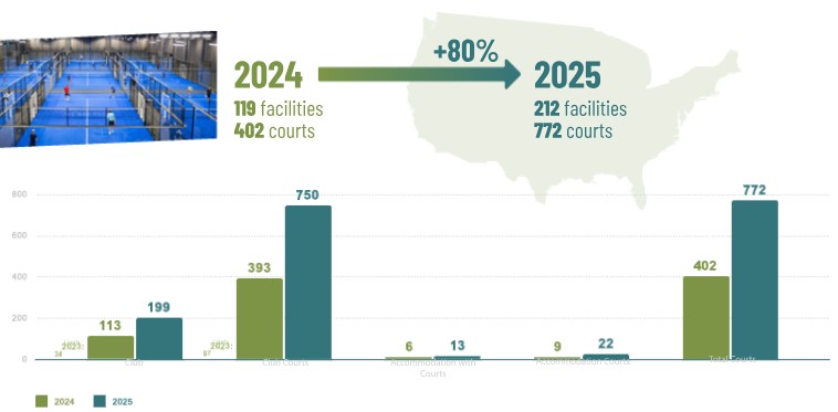 In just three years, the growth is extraordinary: from 103 courts in 2022 to 772 in 2025. This evolution positions the United States as the world’s fastest-growing and highest-potential padel market.
