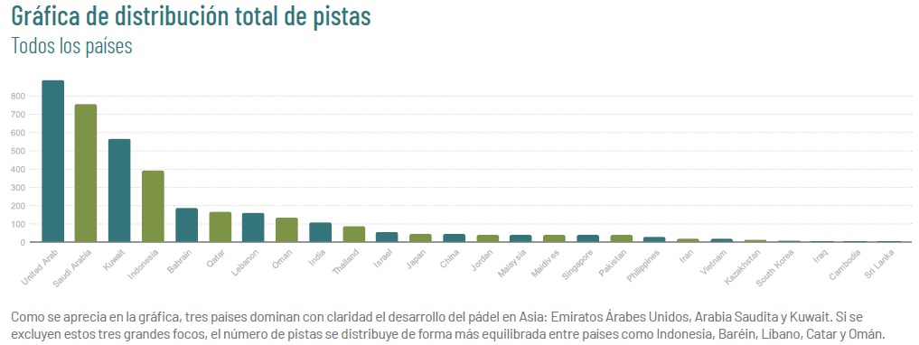 La gráfica del número de pistas por país en el continente asiático pone de relieve una altísima concentración de infraestructuras en tan solo tres mercados: Emiratos Árabes Unidos (814 pistas), Arabia Saudita (743) y Kuwait (558). En conjunto, suman 2.115 pistas, lo que representa una mayoría abrumadora dentro del panorama asiático actual. Esta fuerte concentración indica que, en Asia, el desarrollo del pádel se ha vinculado principalmente a países con elevados niveles de inversión, fuerte crecimiento urbano y políticas activas de diversificación deportiva y turística.